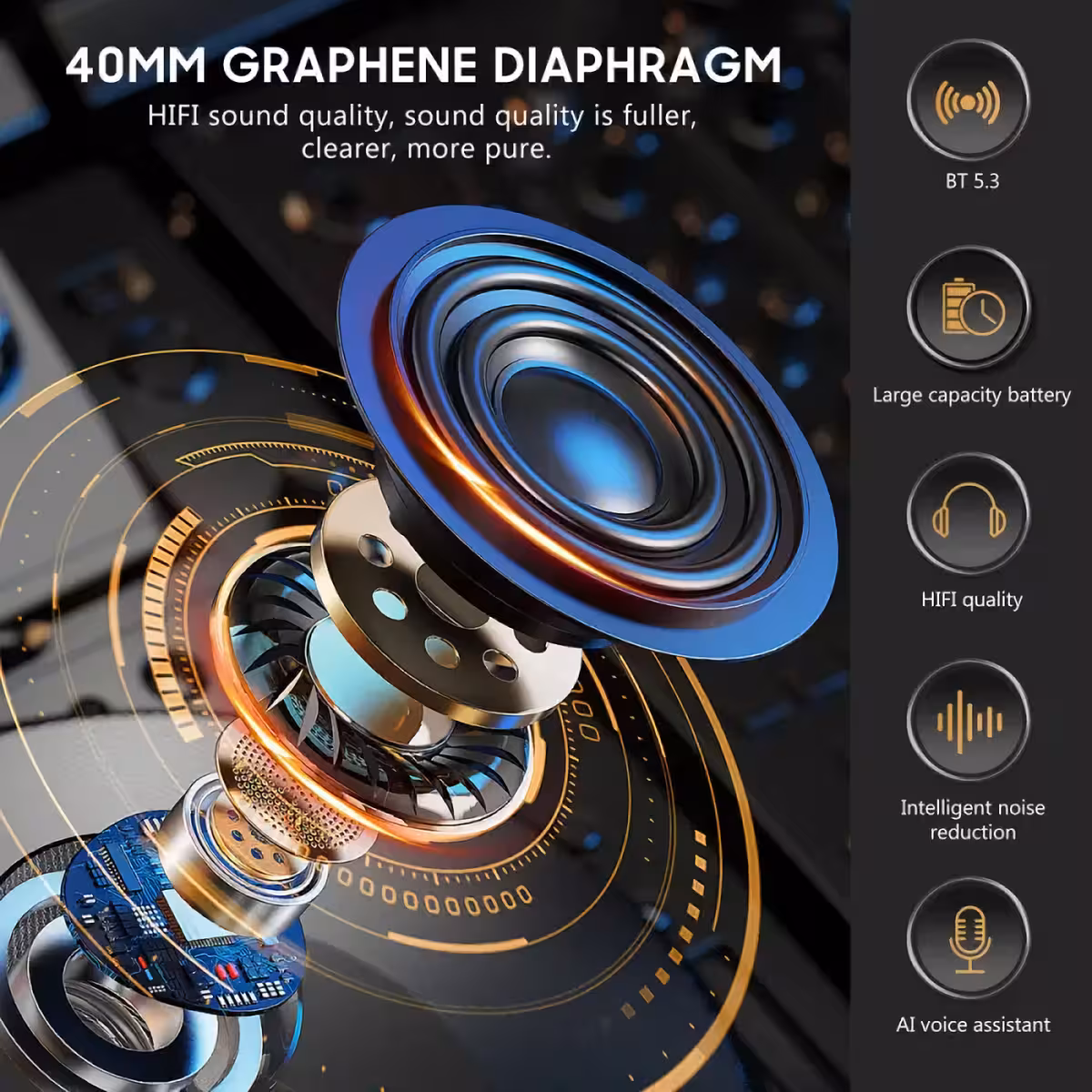 - 40mm grafeeni diafragma: Selge HiFi heli, nutikas mürasummutusega kõnede ajal.