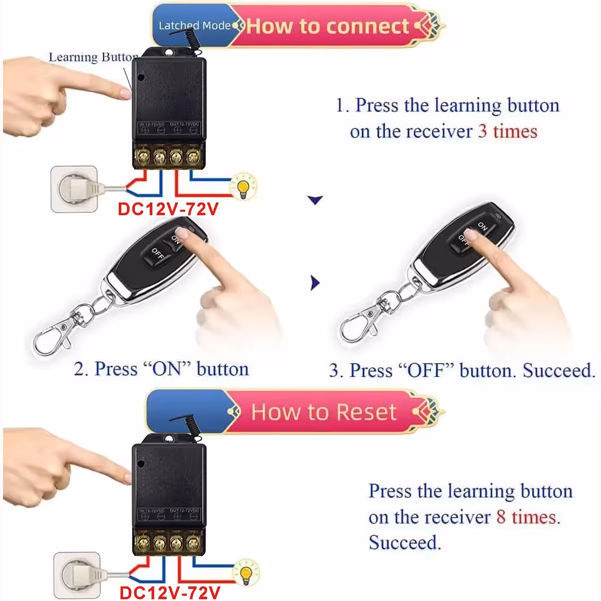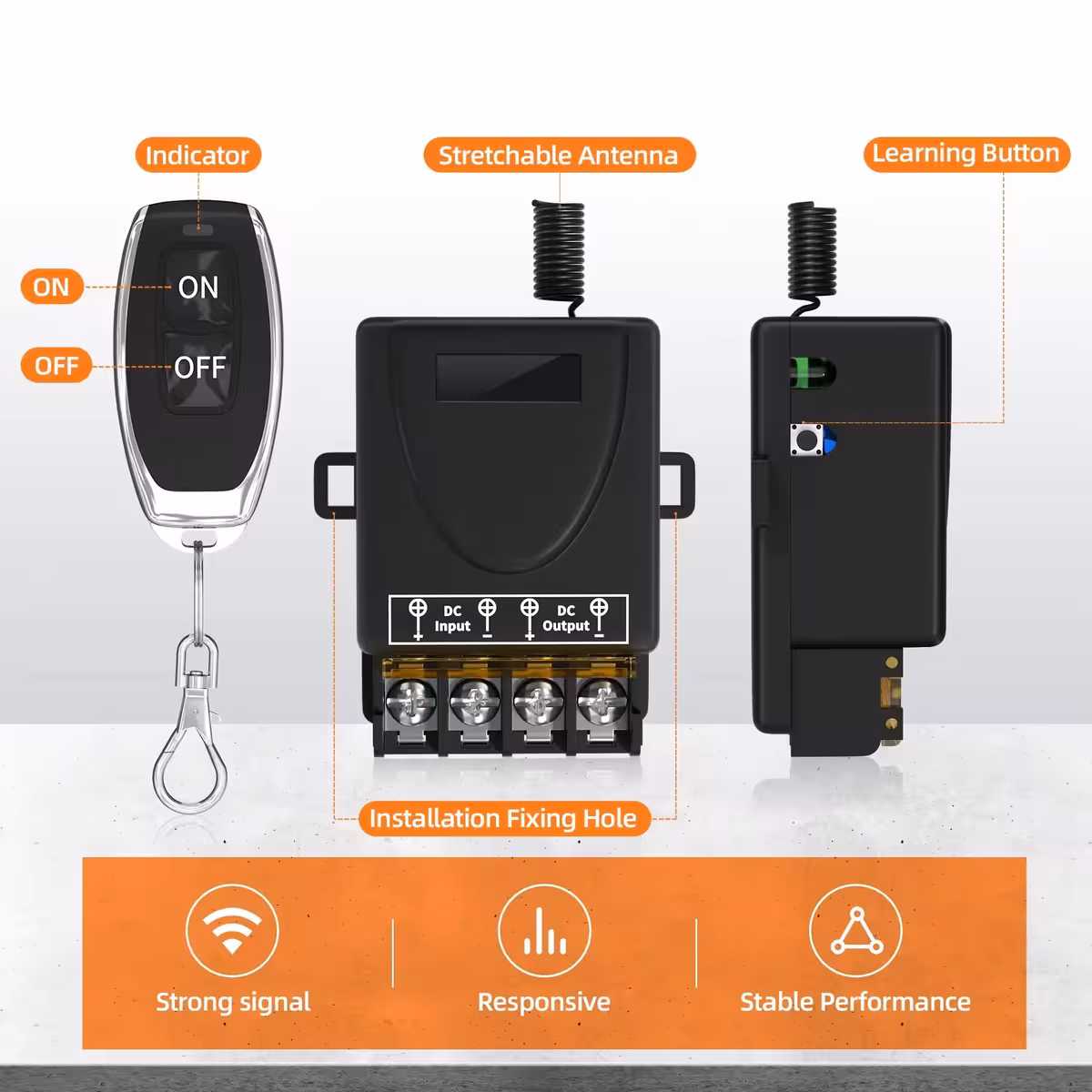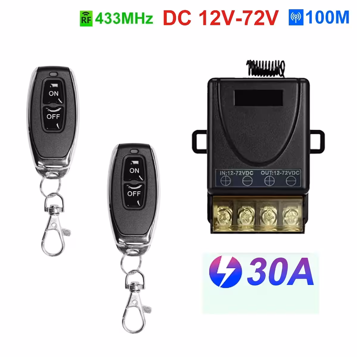 See 12V–60V 30A kaugjuhtimisega relee on kõrge võimsusega lüliti, ideaalne pumpade, valgustite, masinate, pistikupesade, autot või koduseadmete ning nutikodu süsteemide kaugjuhtimiseks. Töötleb RF sagedusel 433,92MHz ja on varustatud 2 kaugjuhtimispuldiga.