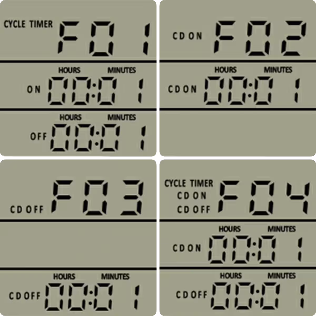 - F01: ajastuse režiim – töötab ainult ON peal, kordab tsüklit.