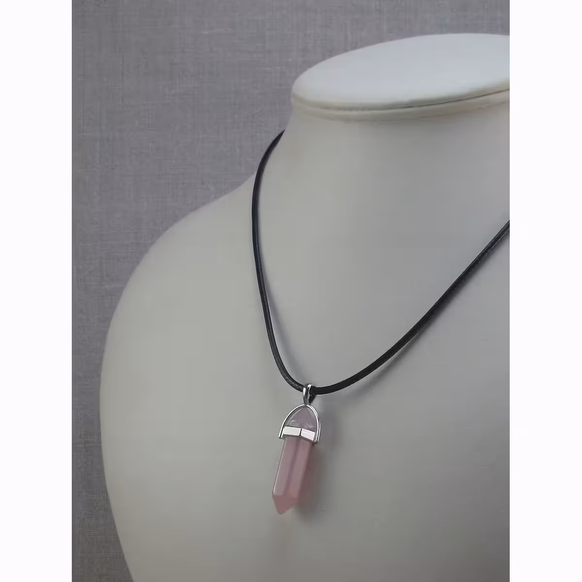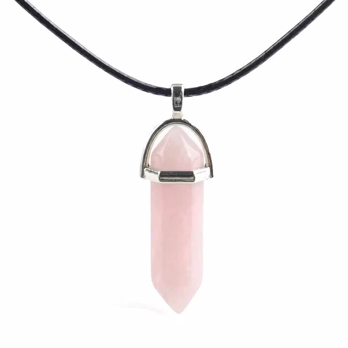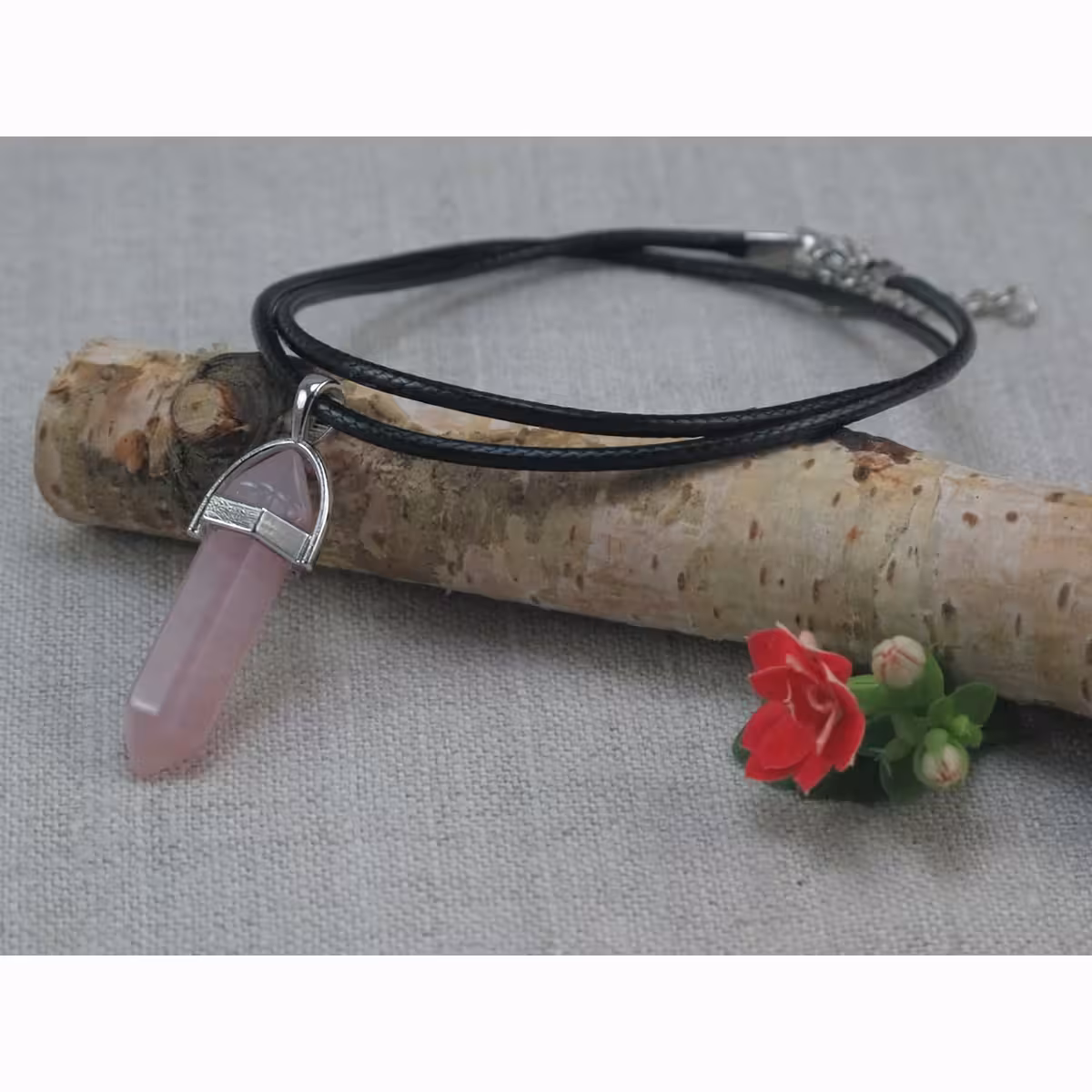 Pakk sisaldab: roosa kvarts ripats ja nahast kett, elegantne ja vastupidav, kinnitusega karabiiniga.